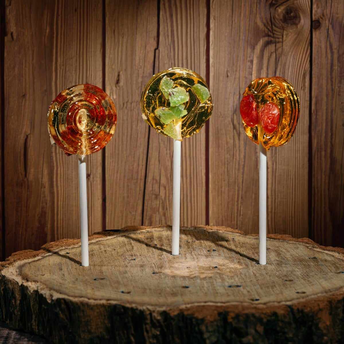 Saját készítésű kézműves főzőtt nyalókák , mézből , aszalt gyümölcsökkel ízesítve.